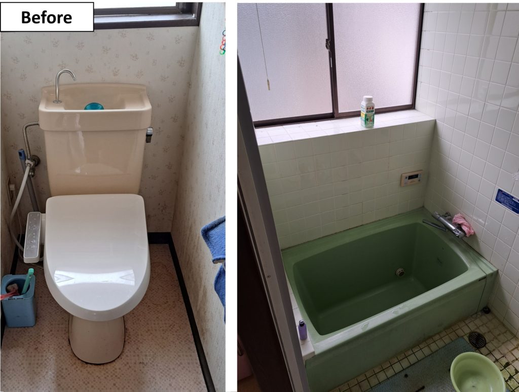タイル浴室のお風呂を解体し最新のユニットバスへ交換、トイレは便器交換・壁や床は掃除がしやすいホーローパネルで施工。